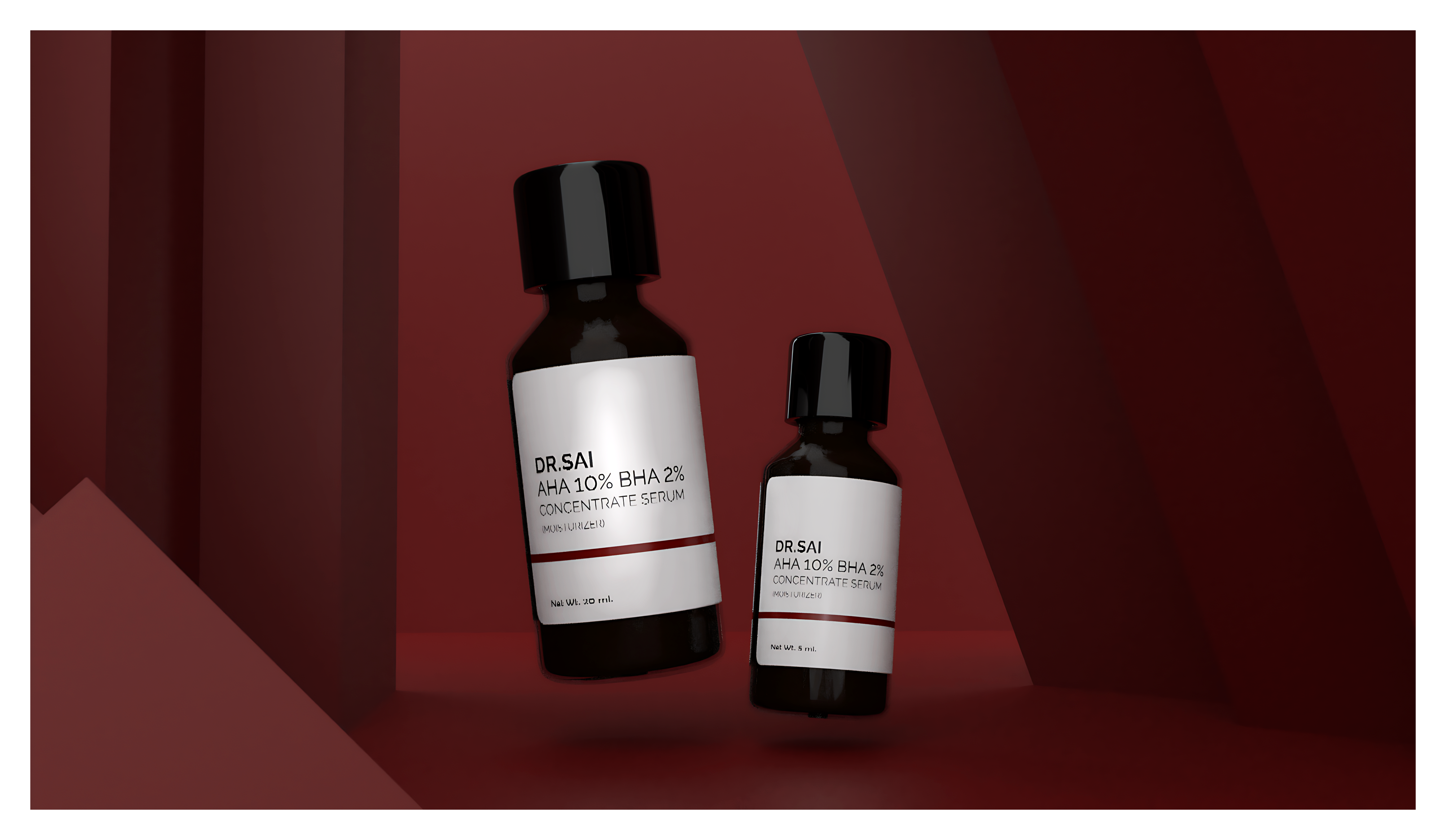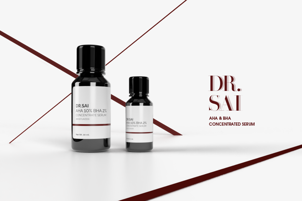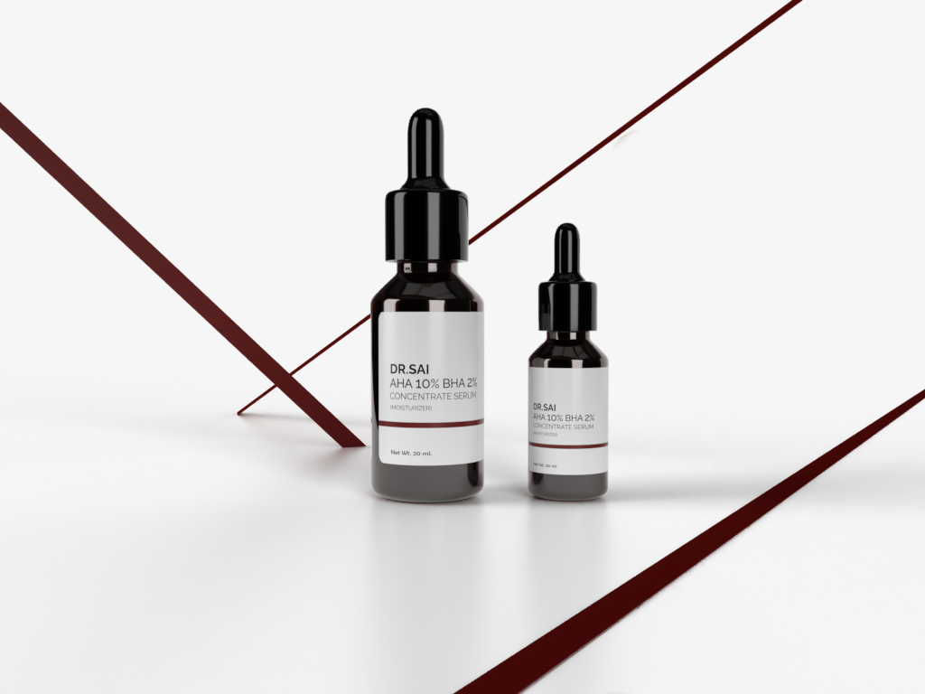 This visual presentation highlights the identity and packaging of DR. SAI’s AHA 10% BHA 2% Concentrated Serum, a high-performance skincare product designed for exfoliation, texture refinement, and clarity.