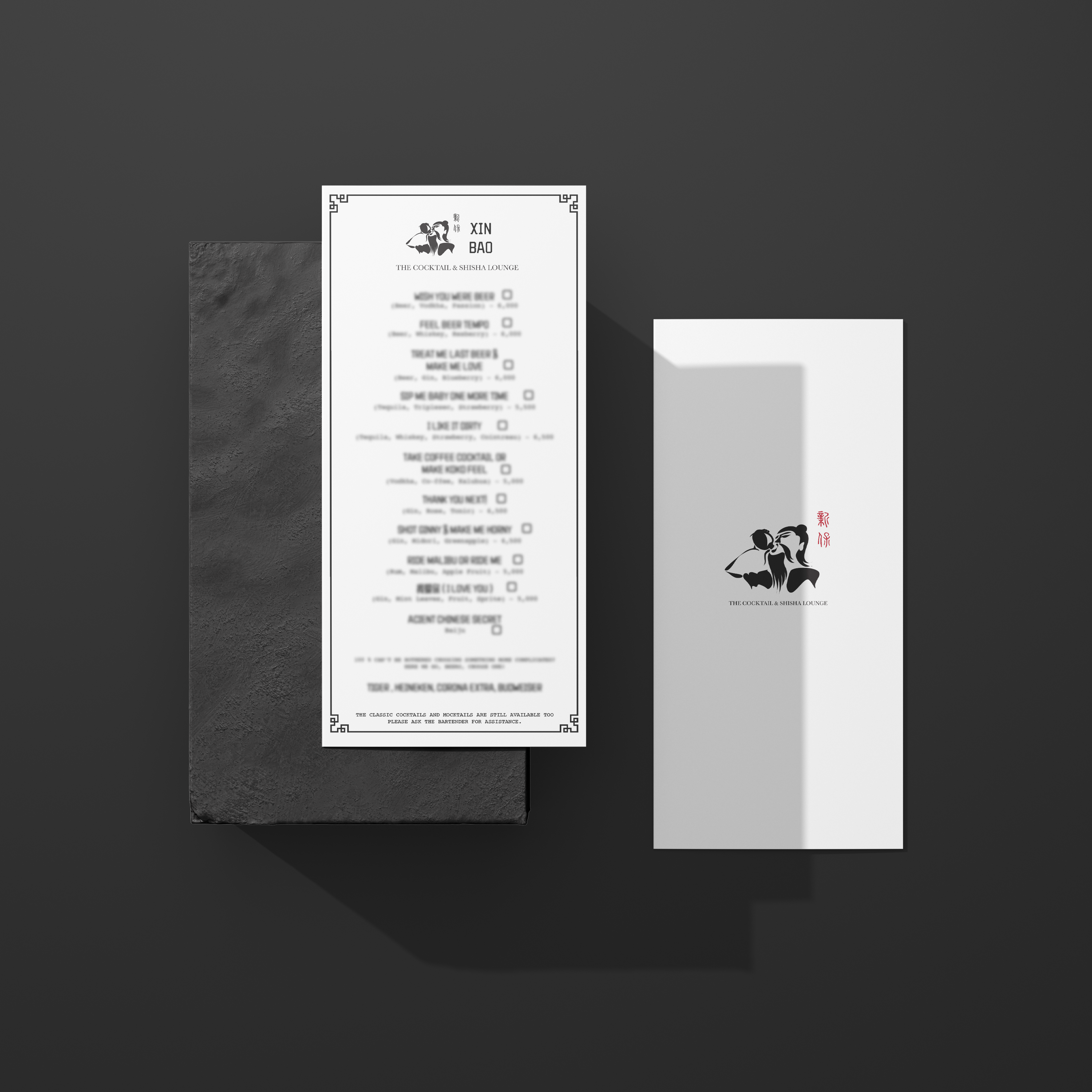 This project showcases the complete visual system I personally developed for "XIN BAO" , a sophisticated cocktail and shisha lounge. My goal was to create visuals that evoke a sense of mystery, allure, and refined indulgence, helping to establish XIN BAO as a unique destination for evening entertainment. The designs blend classic elegance with a touch of contemporary intrigue.